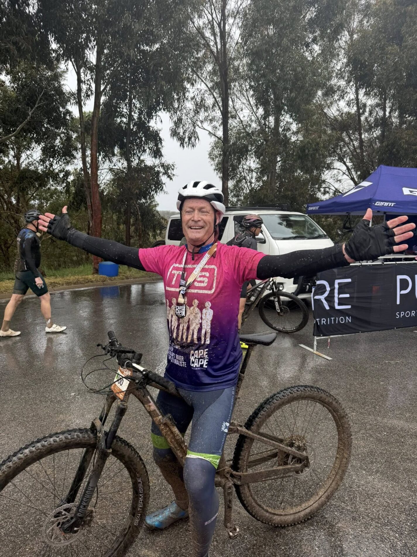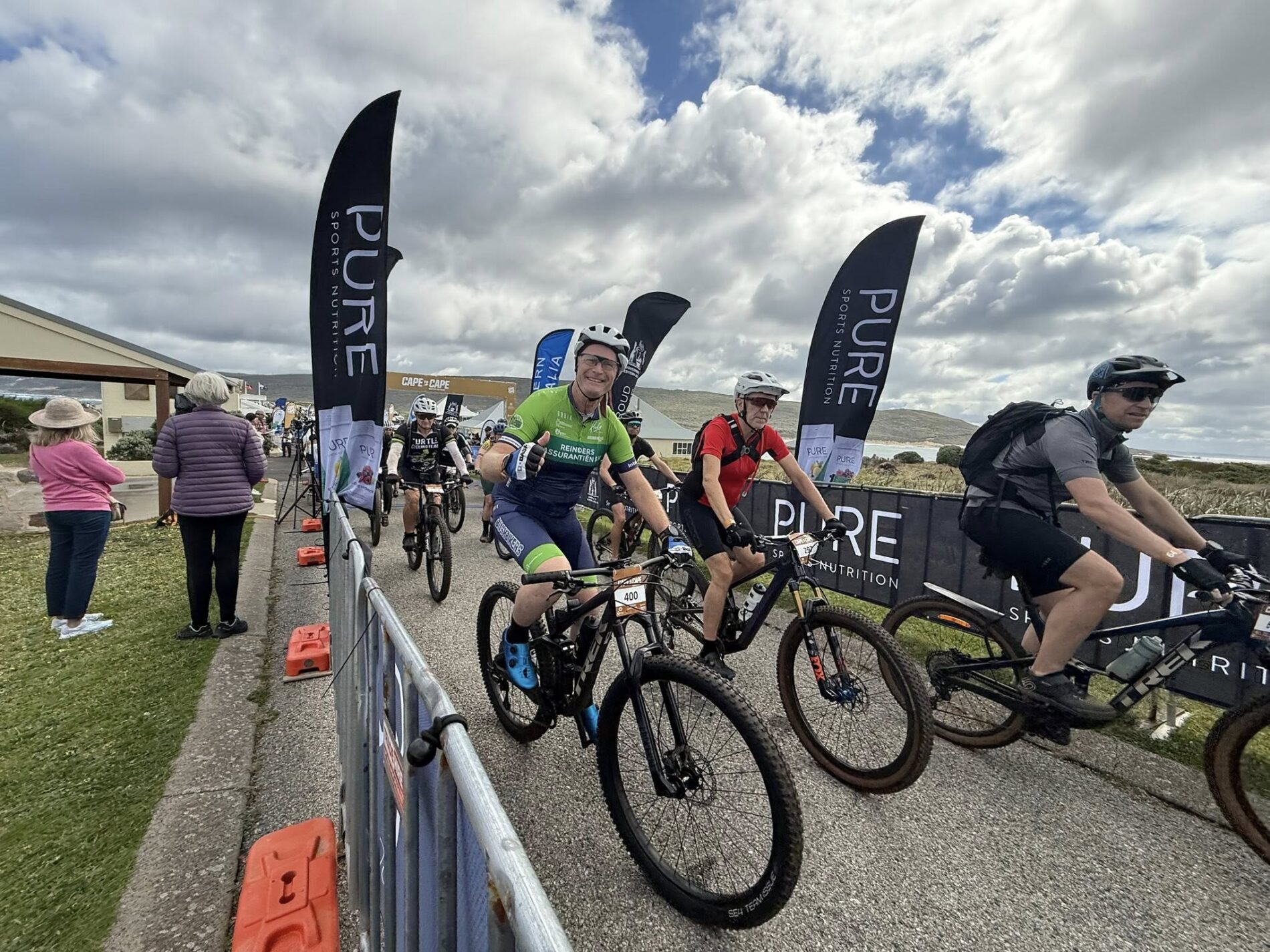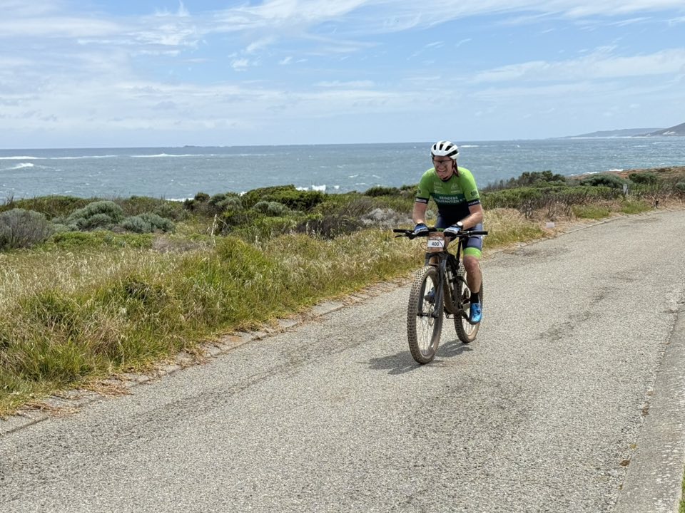 Om half zeven ging de wekker. Allememachies wat lag ik nog in coma. Met een schele jetlag-hoofdpijn strompelde ik naar beneden, mikte een bord muesli en een sloot koffie naar binnen, en hup: met z’n drieën de auto in. Na een half uur rijden in een lange rij auto’s met fietsenrekken en trailers rijden we de aangegeven parkeerplaats op. Daarvandaan gaan er shuttle busjes naar de start en finish bij de vuurtoren op Cape Leeuwin.